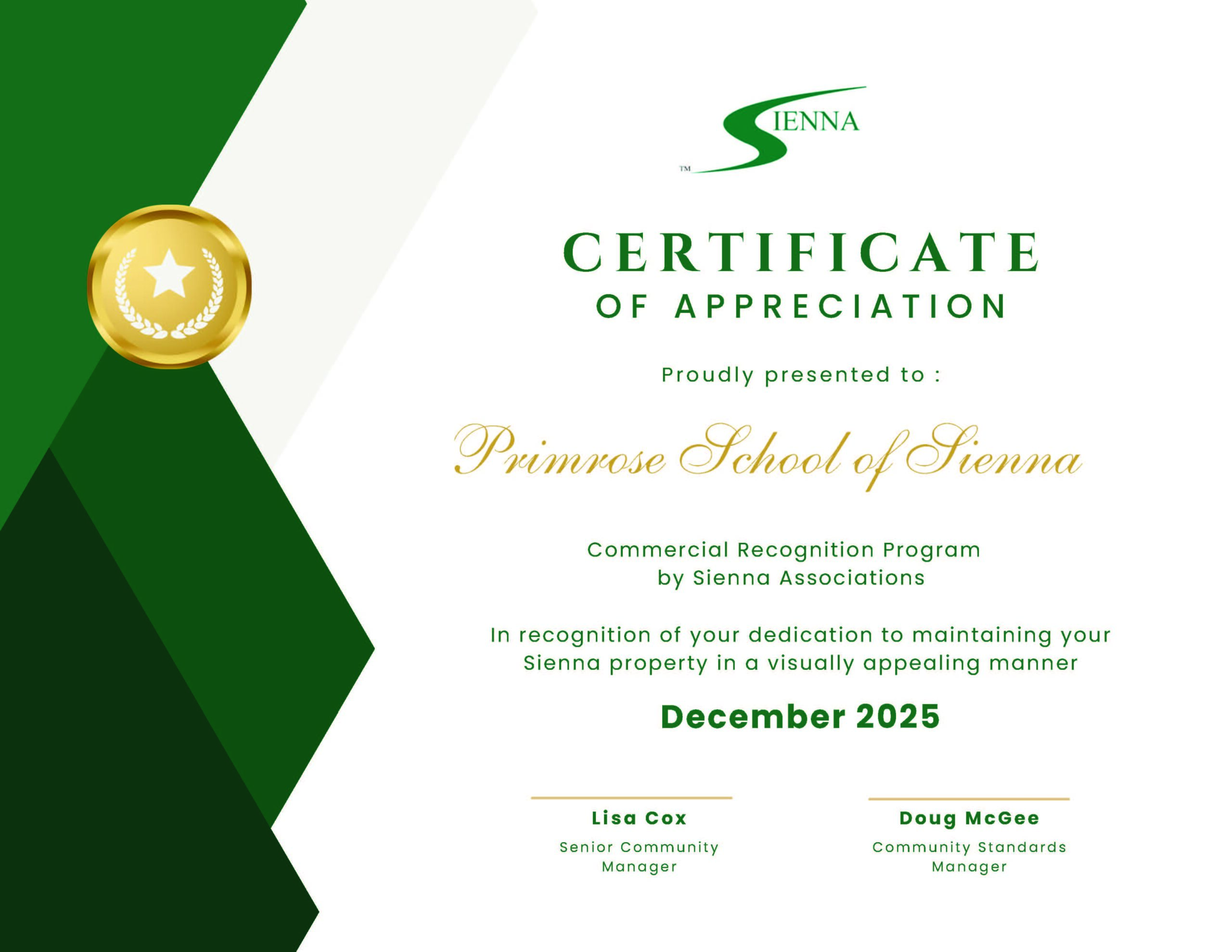 The Sienna Property Owners Association (SPOA) awarded Primrose School of Sienna its Commercial Recognition Award (4th quarter, 2025). The award is presented to commercial property owners/tenants that have shown dedication to maintaining
